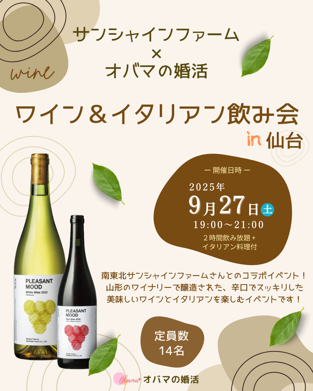| 2025年9月27日(土)19時~ | ワイン&イタリアン飲み会 ワインとイタリアンを楽しむ飲み会イベント参加者募集中です!!(*^▽^*) 南東北サンシャインファームさんとのコラボイベントです! 山形のワイナリーで醸造された、辛口でスッキリした美味しいワインとイタリアンを楽しむイベントです♪ ■イベント詳細 【日程】9月27日(土) 19時00分〜(18:30~受付開始予定) 【会場】ライトハウス仙台本町 仙台市青葉区本町2−9−2 本町エンドウビル505号室 MAP:https://maps.app.goo.gl/yYMTd1FATq9Fgrif9 ※レンタルスペースを貸し切りしてのイベントとなります 会費:男性7,300円(税込)・女性4,000円(税込) 2時間飲み放題&イタリアン料理付 ※ワイン(赤・白・スパークリング)の他に、ビール・ハイボール・レモンサワー・カクテル・ソフトドリンク等のご用意もあります。 ■定員:14名 ※募集は締め切りました |
